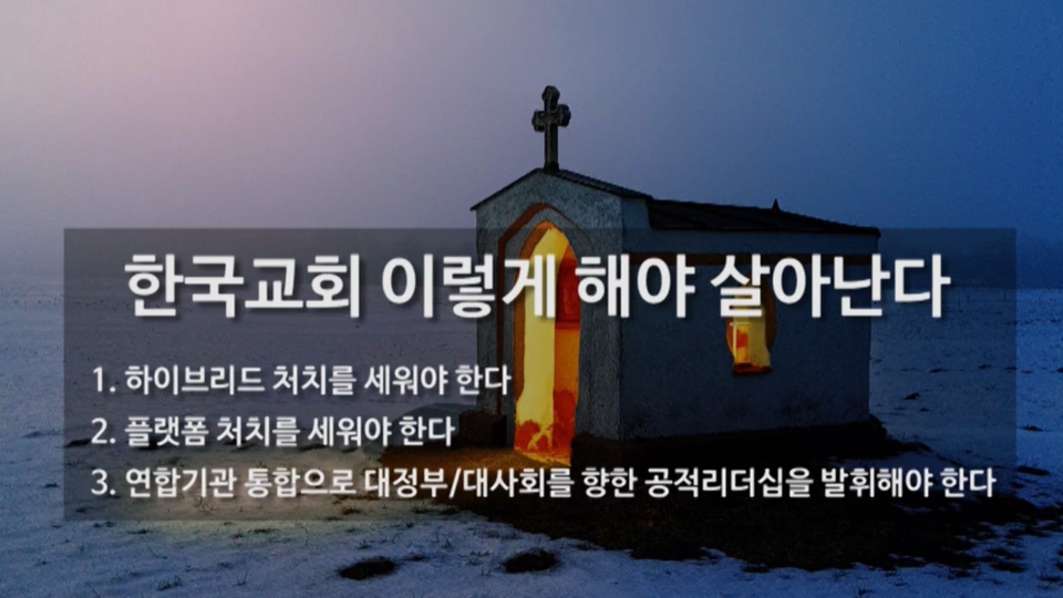 그런데 이것은 어느 한 교회, 어느 한 교단의 힘만으로는 안 된다. 분열된 연합기관을 하나로 만들어 원 리더십, 원 메시지를 내야 한다. 연합기관 통합이 이뤄진다면, 앞장서서 코로나 아웃을 선언하고 자율 방역 매뉴얼과 시스템을 구축해야 한다. 한국교회가 통합된 연합기관을 통하여 한 목소리를 내고 누가 봐도 완벽하게 선제 방역을 한다면 정부도 협조하게 되리라고 본다. 그렇게 해서 우리는 빼앗긴 예배의 주권도 되찾아올 뿐만 아니라, 교회 세움 운동도 다시 일으킬 수가 있다.