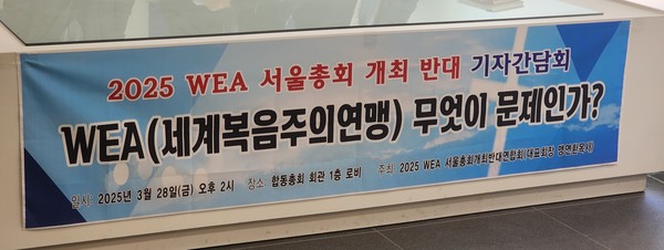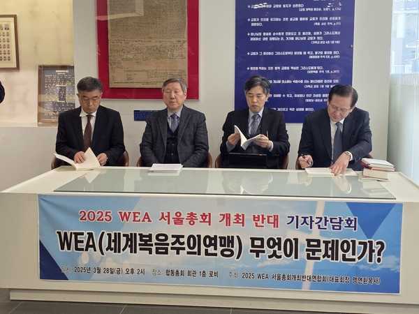 지난 3월 28일 WEA서울총회개최반대연합회(대표회장 맹연환 목사)가 ‘WEA(세계복음주의연맹) 무엇이 문제인가?’라는 주제로 예장합동 총회회관에서 기자간담회를 진행했다.