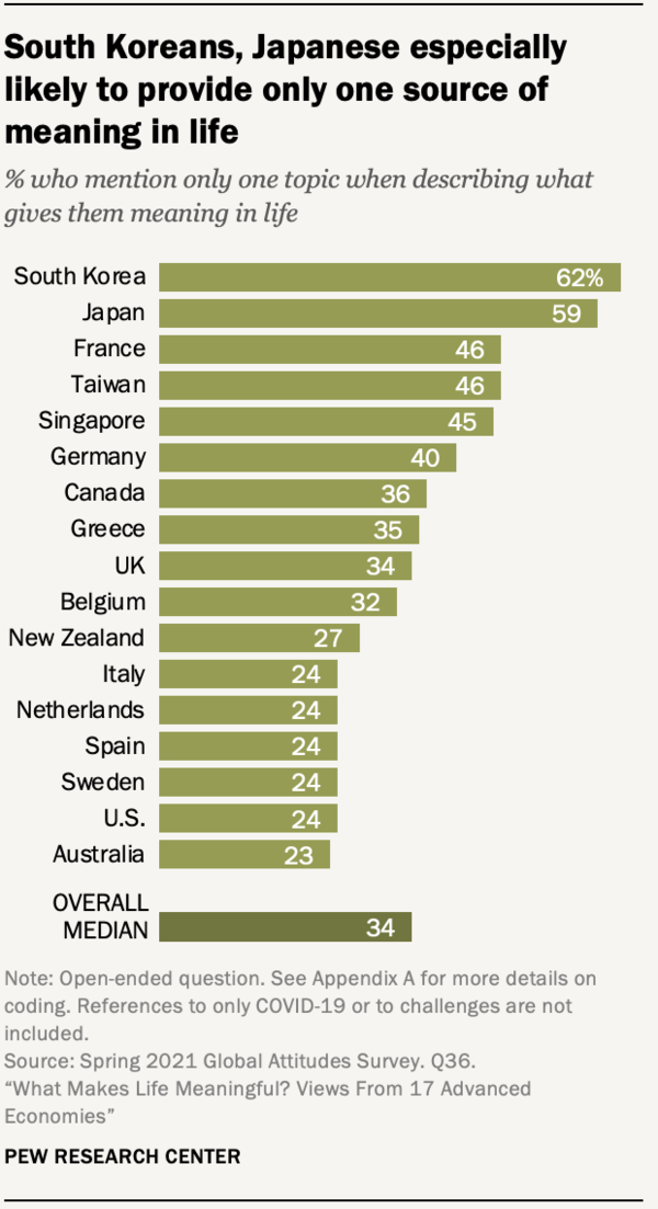 17개국 평균응답에서, 사람들이 중요하게 여기는 2위는 직업, 4위는 친구관계다. 직업과 친구관계는 한국에선 중요하게 여겨지지 않아, 순위에도 들지 않는다. 직업은 대부분의 국가에서 사람들에게 의미 있는 상위 세 가지 원천 중 하나니다. 그러나 이들에 대한 강조점은 이탈리아의 최고 43%에서 한국의 최저 6%까지 매우 다양할 수 있다. 이탈리아에서는 가족을 의미의 원천으로 생각하는 만큼 직업을 언급하는 사람이 많지만, 미국과 같은 곳에서는 직업을 언급하는 사람의 3분의 1 정도에 불과하다.