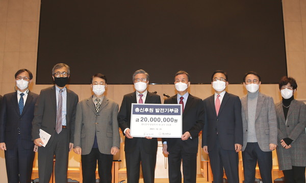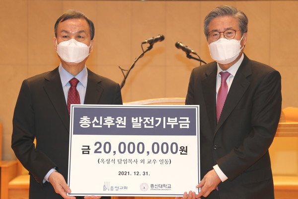 충정교회(옥성석 목사)는 지난 12월 31일 총신대학교(총장 이재서)에서 총신대학교 발전기부금 전달식을 가졌다. 마침 총신대학교 종무예배 설교를 맡은 옥성석 목사는 당회와 충정교회 교인들의 뜻을 모아 총신대 발전기부금을 전달하게 되었다며 “작은 금액이지만 총신대학교 발전을 위한 작은 밑거름이 되었으면 좋겠다”고 하였다.