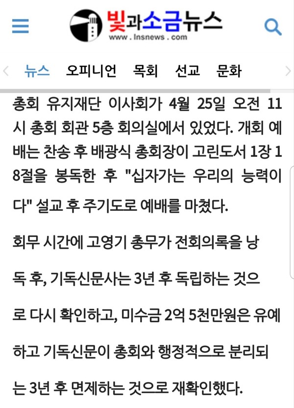 지난 4월 25일 기독신문 구조조정처리위원회가 총회 임원회를 통해 기독신문 이사회에 공문으로 전달한 구조조정 권고안이 거부당했다. 여기에 유지재단이사회도 기독신문에 동조하고 편들고 나서서 기독신문 구조조정위원들은 반발하고 있다.