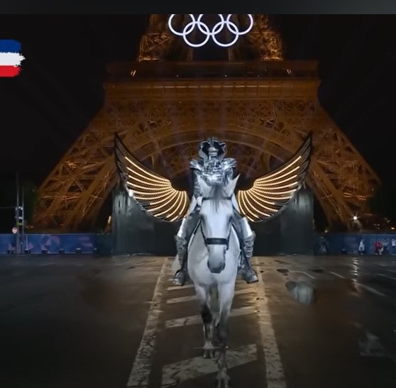 타락 천사의 황금빛 날개를 배경으로 얼굴없는 자가 백마를 타고 입장하고 있다. 그들의 메시아 '적그리스도' 출현이 곧 있을 것임을 예고하는 것이다. 이것이 단순한 파리 올림픽 개막식 축하행사라고?