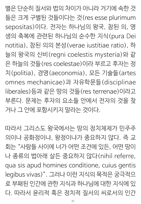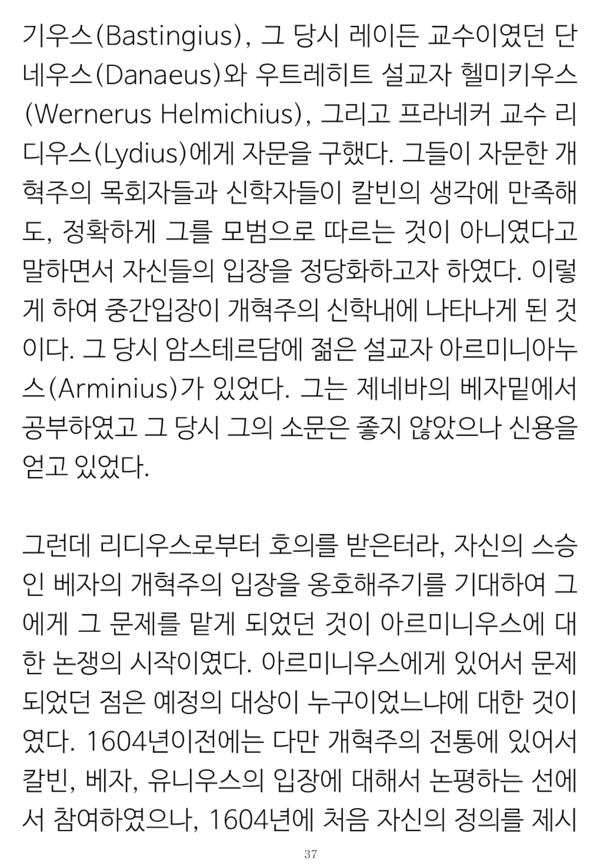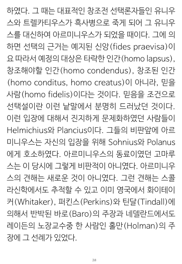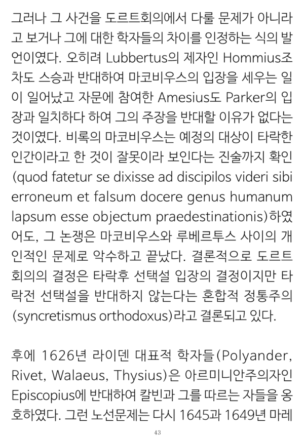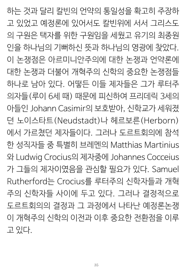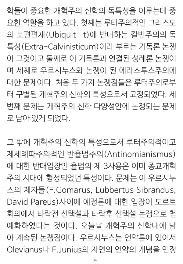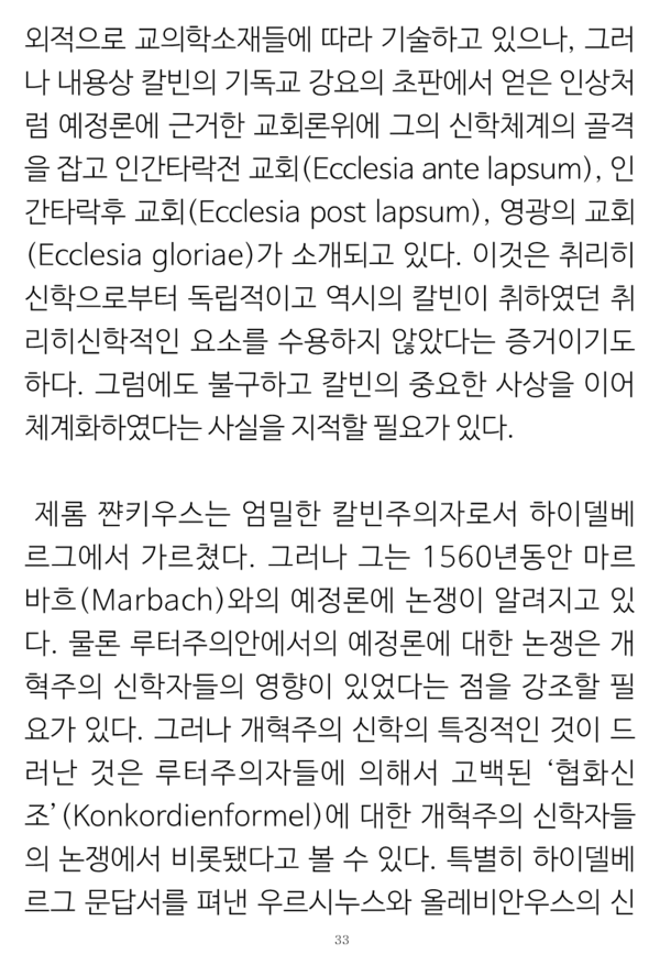 그런 일치점이 기독교 강요 1536년에서부터 증명된 것으로 그 초판에 있는 표현들 그대로를 창조전 그리고 언약 개념들이나 교회 개념들 및 율법에까지 적용이 되는 그런 교리들의 통일성의 소제목들로 나누어 증명해 보였다.
