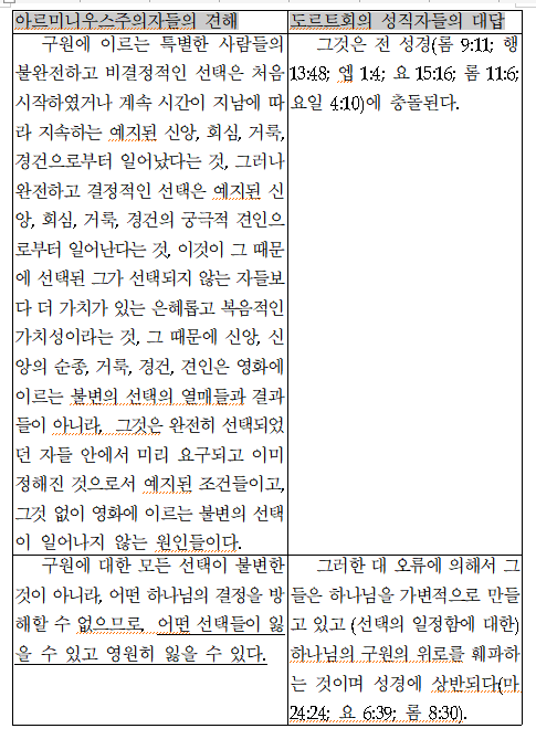 10) 그 선택은 여러 가지가 아니라 신약에서나 구약에서나 하나요 동일하다. 즉 하나님의 작정하시고 기뻐하신 뜻은 하나요 유일하며(een eenig welbehagen, voornemen en raad des willens Gods) 그것을 통하여 영원 전부터 우리를 택하시되, 구약이나 신약이나 동일하게 은혜와 영광과 구원과 우리가 그 안에 행하도록 그가 준비하신 구원의 길에 이르도록 택하셨다.