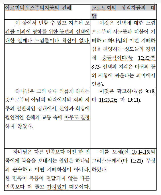 비록 강퍅할지라도, 이 결정에 따라 하나님은 택자들의 마음을 은혜로부터 부드럽게 하고 굽히어 믿도록 하시고 그의 택자들이 아닌 자들을 그의 의로운 판단에 따라서 그들의 악과 강퍅케 됨으로 내버려 두신다. 여기에 그리고 이런 식으로 그들은 깊은 인간의 차이, 긍휼히 여기시고 의로우신 차이, 선택과 유기의 결정을 인식하고 고백하고 있다. 이런 식의 고백은 하이델베르그 고백의 순서에 따라 그에 대한 해석의 차원인 듯한 인상을 얻게 된다.