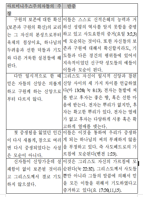 그것을 통하여 하나님께서 참된 신자들을 은혜가운데 확증하시고 보존하시는 그의 능력이 얼마나 더 큰지, 긍휼이 풍부하신 하나님께서 비참한 타락에서조차도 선택의 불변의 의지에 따라 성령을 자신의 백성으로부터 완전히 거두시지 않는다. 그들이 영접의 은혜와 칭의의 신분으로부터 타락할 만큼 혹은 죽음의 죄에 이르거나 성령을 해방하는 죄에 이를 만큼 타락하지 않는다는 것이 성도의 견인에 대한 고백이다. 그런 고백과 함께 그런 견인과 보존이 갖는 뿌리와 특성들이 고백되었다. 그런 보존의 조건이 인간으로부터 전혀 찾을 수 없고 하나님의 은혜로운 긍휼로부터 옮을 고백하고, 따라서 그런 구원의 방법과 서정조차도 헛되거나 없이 될 수 없다는 성격과 함께 고백되었다. 의지에 이르기까지 전적부패를 인정함으로 모든 이들로 하여금 스스로 겸손케 한다.