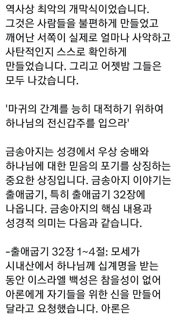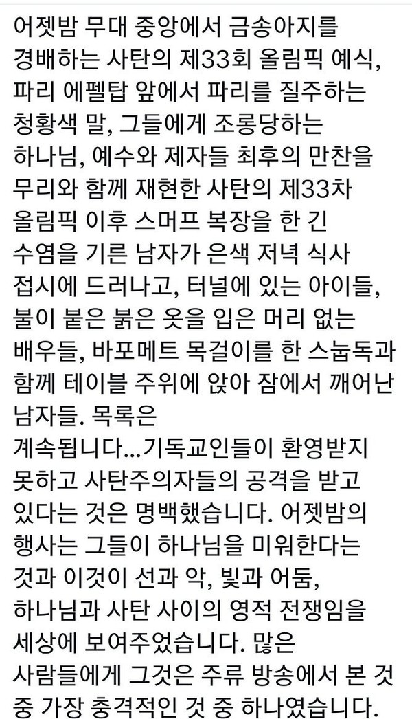 파리 올림픽 개막식은 황당하고 충격적인 행동을 연출하여 "역사상 최악"이라고 불리고 있다. TV중계를 통해서 프랑스 무용수와 레이디 가가를 포함한 세계적인 슈퍼 스타의 공연을 포함하여, 독특한 디스플레이를 보고 경악했다. 이러한 파장으로 프랑스와 프랑스 대통령에게 큰 타격이 올 것이다.