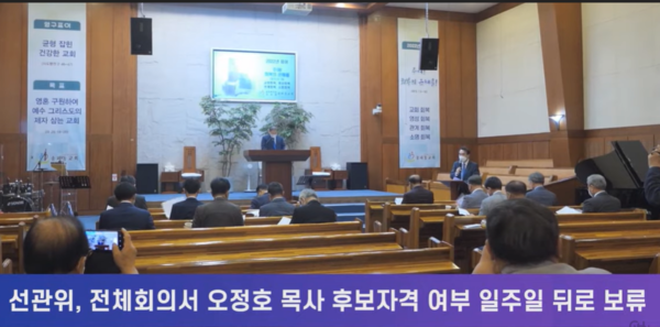 오정호 목사와 관련해서는 심의분과의 보고가 있었으나 당시 여러 의견들이 나왔으며 투표로 가자, 법대로 해야 한다 등 의견이 분분했다고 전했다. 이어 “시간적 유예를 두는 것도 합법”이라고 강조하며 일주일 뒤로 연기됐음을 알렸다.