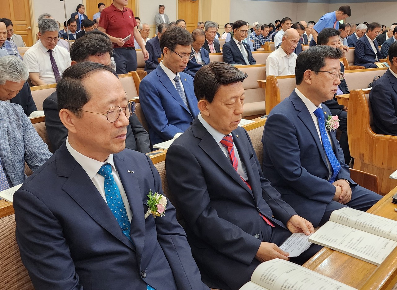 “신자는 이 세대를 본받지 말고 하나님의 뜻을 분별하며 살아야한다. 하나님은 창조주이시며 우리는 피조물이다. 그러므로 우리는 자신의 한계를 알고 자기의 역할을 잘 감당해야한다. 우리를 만드신 하나님의 뜻을 이루며 살아야한다. 내게 맡겨진 역할을 다 함으로 나를 향하신 하나님의 뜻을 분별해야한다. 하나님의 뜻을 제대로 분별하지 못하면 억울해하며 산다. 하나님과의 관계 속에서 살아야 의미를 알게 되고 감사하게 된다. 다른 일에 신경쓰지 말고 땅끝까지 이르러 증인되는 남전도회의 일을 해야 한다”고 강조했다. 축도는 증경총회장 서기행 목사가 맡았다.