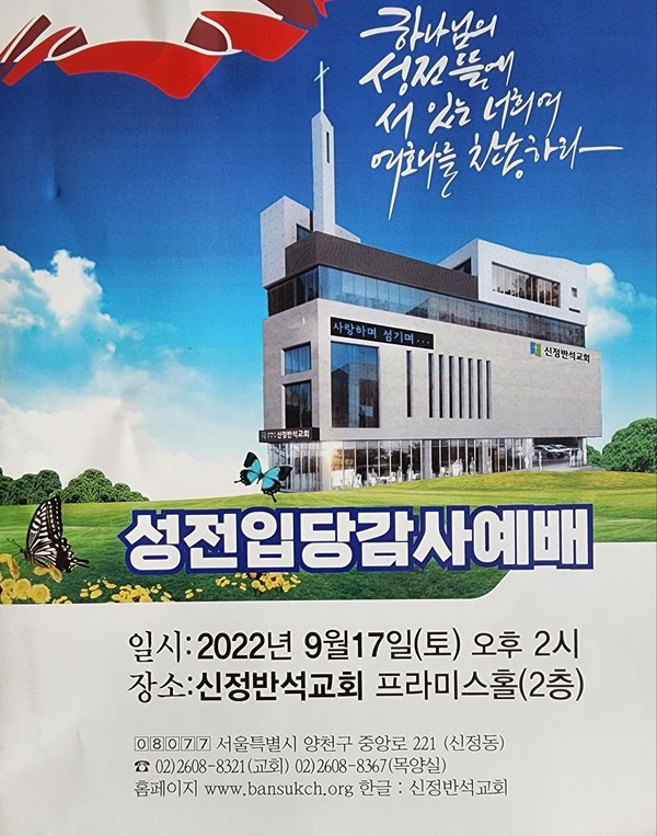 서울시 양천구 중앙로221(신정동)에 위치한 대한예수장로회 신정반석교회(담임목사 여성구)가 지난 9월 17일 어후2시 성전입당 감사예배를 드렸다.