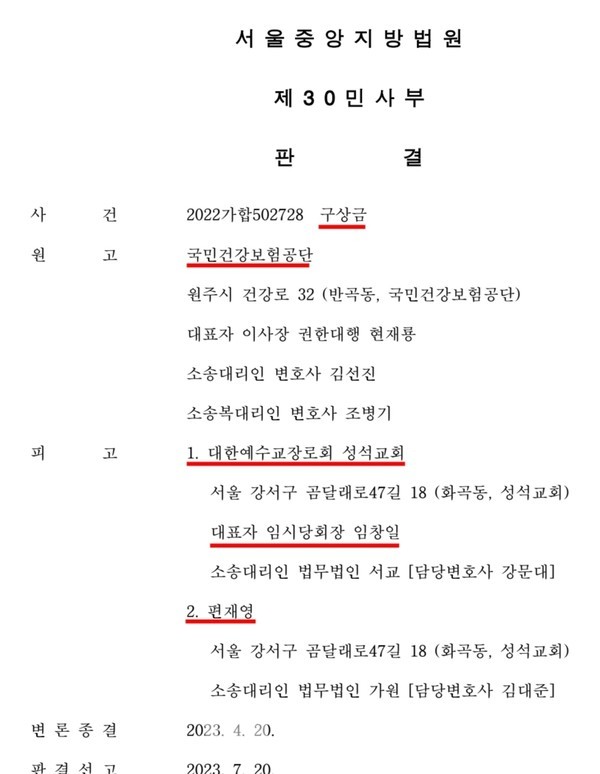 아울러 지난 2023년 7월 20일자로 서울중앙지법으로 부터 성석교회 대표자는 임시당회장 임창일 목사(서경노회)라는 판정을 받았다. 상대방이 항소하지 않았고, 결국 최종확정 되었다.
