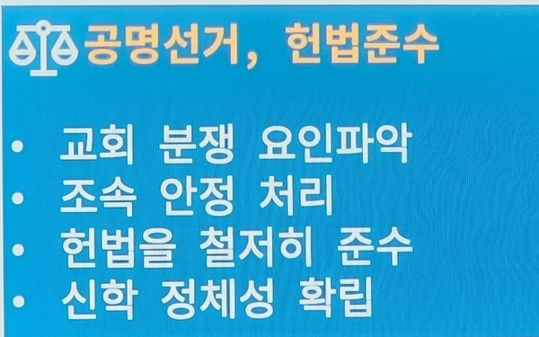 6) 개교회의 분쟁 문제와 총회 공명선거와 헌법을 준수.