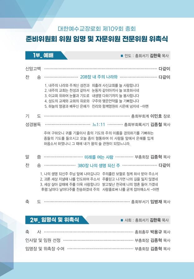 이번 총회준비위원회 구성은 15인으로 했고, 자문위원은 어디까지나 자문위원이며, 총준위원 15명이 실질적으로 총회를 준비하게 된다. 또 전문위원은 내년도 목장기도회 준비를 위해 협력을 받고자 위촉했다고 한다.
