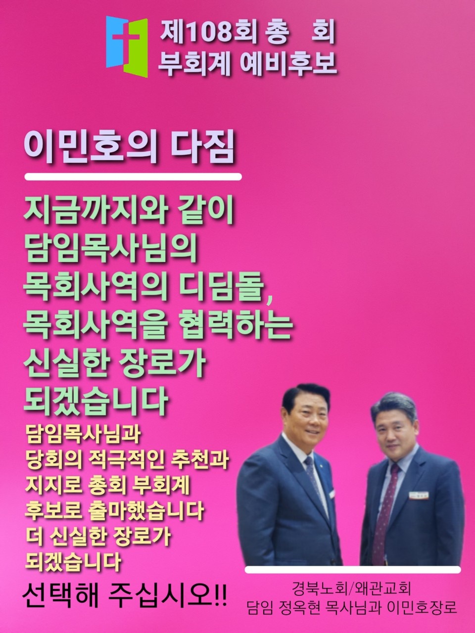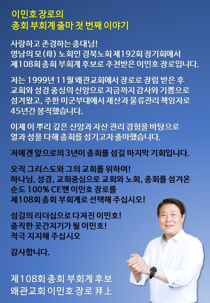 총회이단(사이비)피해대책조사연구위원회에 회계 이민호 장로, 미군이 인정하는 성실함과 믿음을 가진 이민호 장로가 제108회 총회 임원 부회계 후보 기호 추첨에서 1번을 뽑았다.