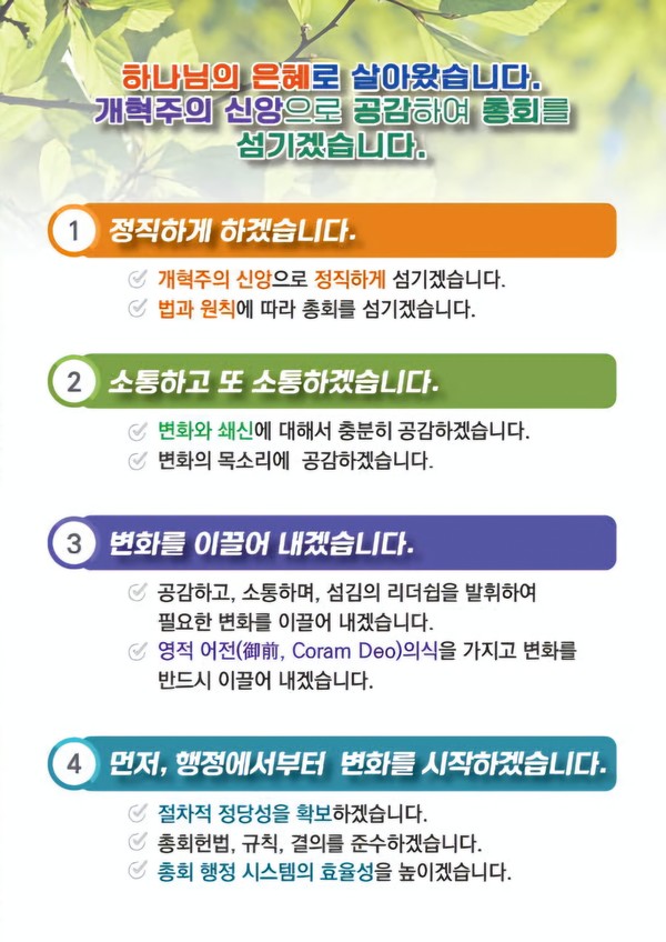 1. 정직하게 하겠습니다. 개혁주의 신앙으로 정직하게 섬기겠습니다. 법과 원칙에 따라 총회를 섬기겠습니다.