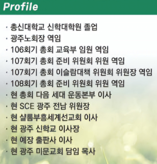 한편 광주노회(노회장:김진택 목사)는 지난 4월 9일 광주청사교회(백윤영 목사)에서 열린 봄 정기노회에서 배정환 목사를 제109회 총회부서기로 추천했다. 배정환 목사는 총회이슬람대책위원장, 광주신학교 이사장 등을 역임했다.
