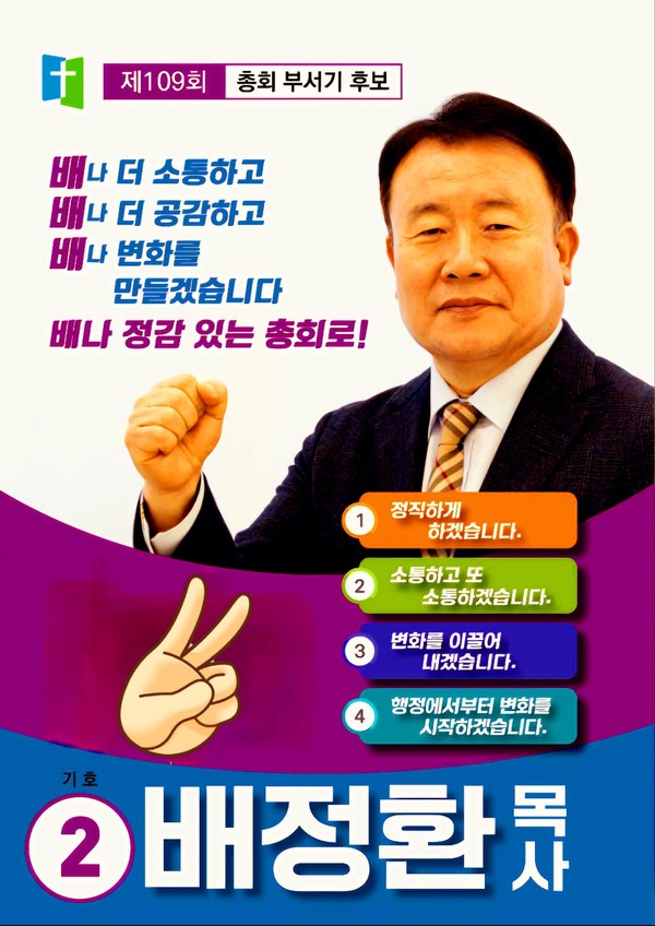 제109회기 총회 부서기 입후보자 광주노회 배정환 목사입니다. 저는 우리 합동총회에 대한 분명한 문제의식 속에서 소명을 감당하기 위해 출마하게 되었습니다. 저는 소명을 감당하기 위해 네 가지를 실천하겠습니다.
