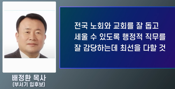 배 목사는 “당선이 된다면 정치적으로 편향된 모습이 아니라 전국 노회와 교회를 잘 돕고 세울 수 있도록 행정적 직무를 잘 감당하는데 최선을 다할 것”이라고 아래와 같이 포부를 밝혔다.