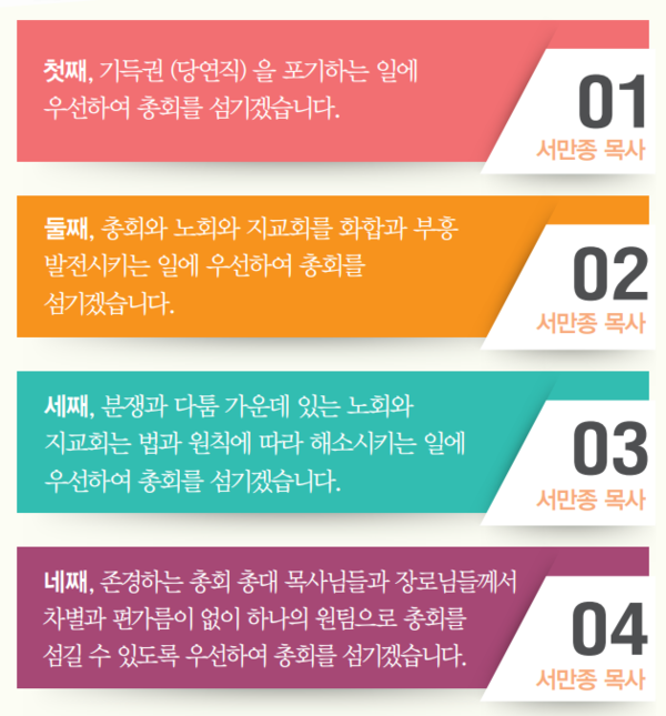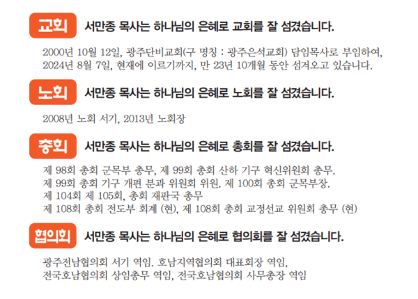서만종 목사는 총회군목부장과 호남협의회 대표회장 등을 역임했으며, 현재 총회전도부 회계로 섬기는 중이다. 서 목사는 “선의의 경쟁을 통해 당선이 될 수 있도록 최선을 다하겠다”면서 “당선이 되면 하나님을 두려워하는 자세를 가지고 겸손히 섬기며, 헌법과 규칙과 절차에 따라 직무를 감당할 것”이라고 밝혔다.