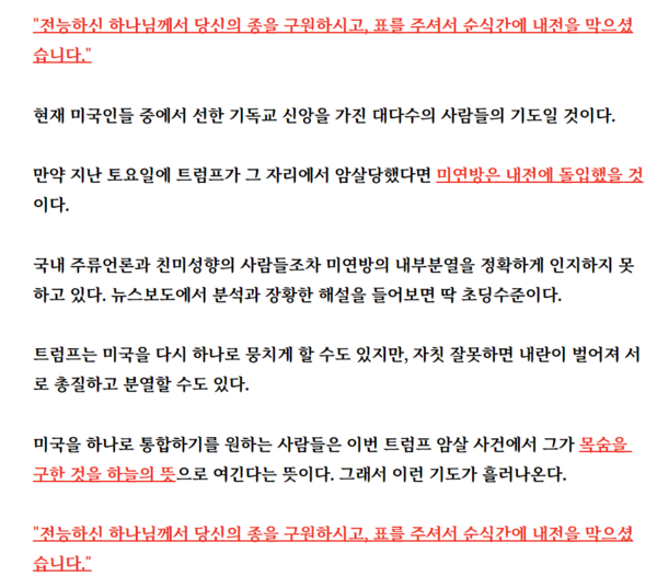 이번 암살 시도에서 트럼프가 살아나왔을 뿐 아니라, 민주당은 제대로 대처하지 못했고, 주류언론은 그들이 공범임을 확인했다. 이제 트럼프는 거의 무제한의 정치적 실탄과 대중의 지지를 받고 있다. 그들은 살아있는 순교자를 만들었다.