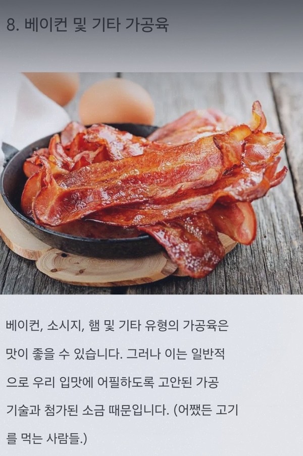 가공육에는 칼로리가 높은 포화지방이 많이 함유되어 있습니다. 그러한 음식을 섭취하면 체중 증가를 포함한 건강 문제가 발생할 수 있습니다.문제를 더하는 것은 이러한 종류의 고기에서 흔히 발견되는 소금의 수준입니다. 소금을 너무 많이 먹으면 기껏해야 갈증과 탈수 증상을 느낄 수 있습니다. 게다가 가공육은 나중에 위와 장에 문제가 생길 수도 있습니다.긍정적인 측면으로는 베이컨과 소시지는 단백질을 제공하여 포만감을 유지하고 매일 아침 수행해야 하는 모든 작업을 수행할 수 있게 해줍니다. 하지만 동물성 단백질이 풍부하고 더 건강한 아침 식사 옵션은 계란이므로 수란 삶은 계란이나 스크램블 계란 두 개를 선택하세요.