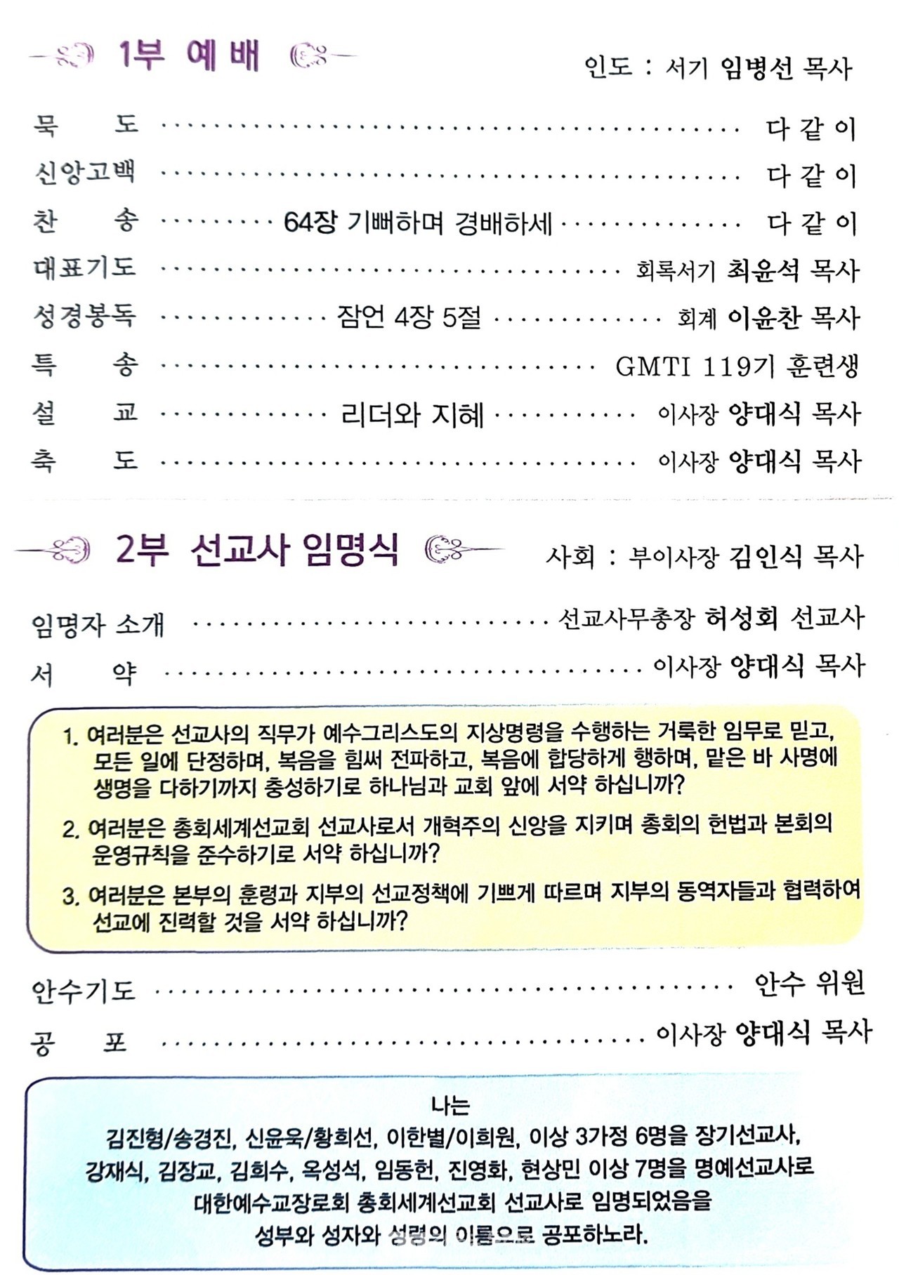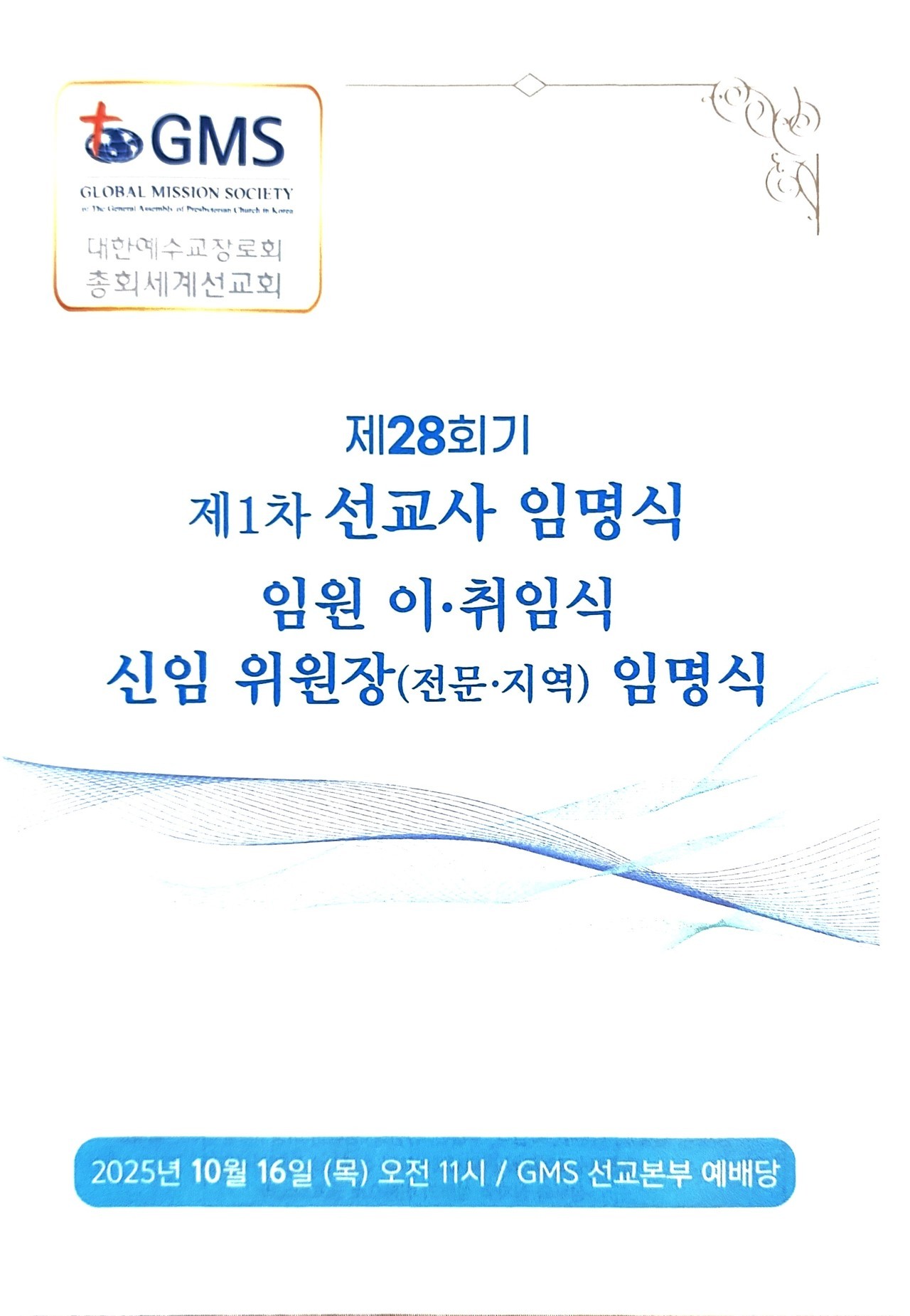 지난 10월 16일 오전 11시 GMS 총회세계선교회(이사장 양대식 목사) 제1차 선교사 임명식 겸 임원 이취임식이 GMS선교본부 예배당에서 거행되었다.