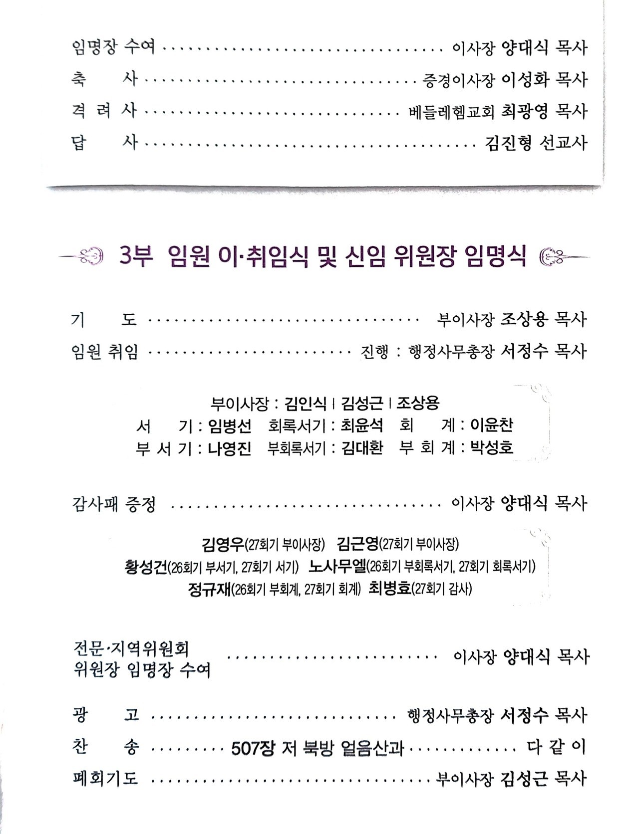 양대식 이사장은 개회예배에서 "리더와 지혜"라는 제목으로 설교했다. 리더는 담대해야하고, 인간관계를 잘해야 한다. 목회도 선교도 관계이다. 관계만 잘되면 천국이 된다. 13 선교사 가정을 파송한 교회의 담임목사로서 참 뿌듯하고 감사하다.