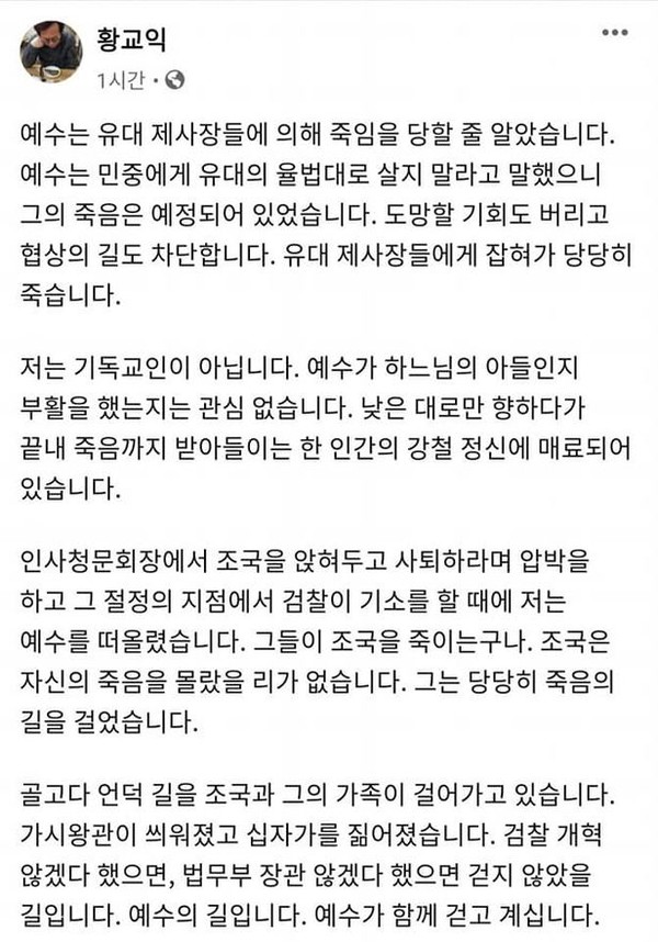 사회주의자요 예수를 하나님으로 믿지도 않는 조국을 가리켜 골고다 언덕 길을 걸어가는 예수에 비유한 문빠가 있다. 물론 황 모라는 듣보잡은 자기 말대로 불신자다.