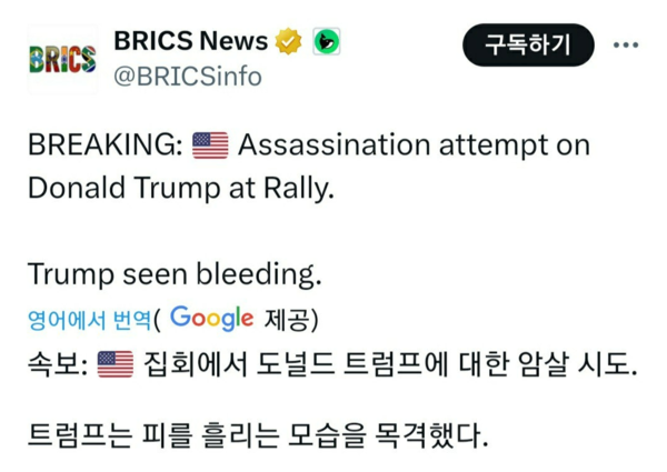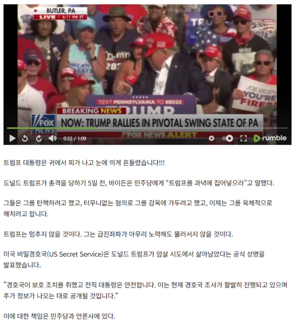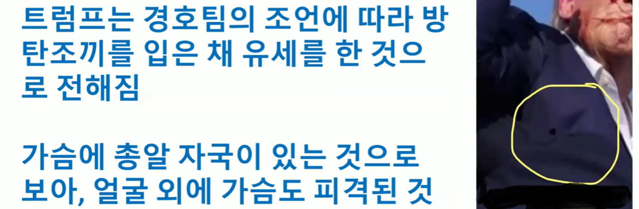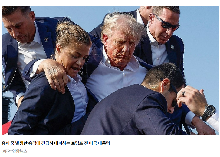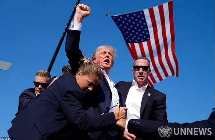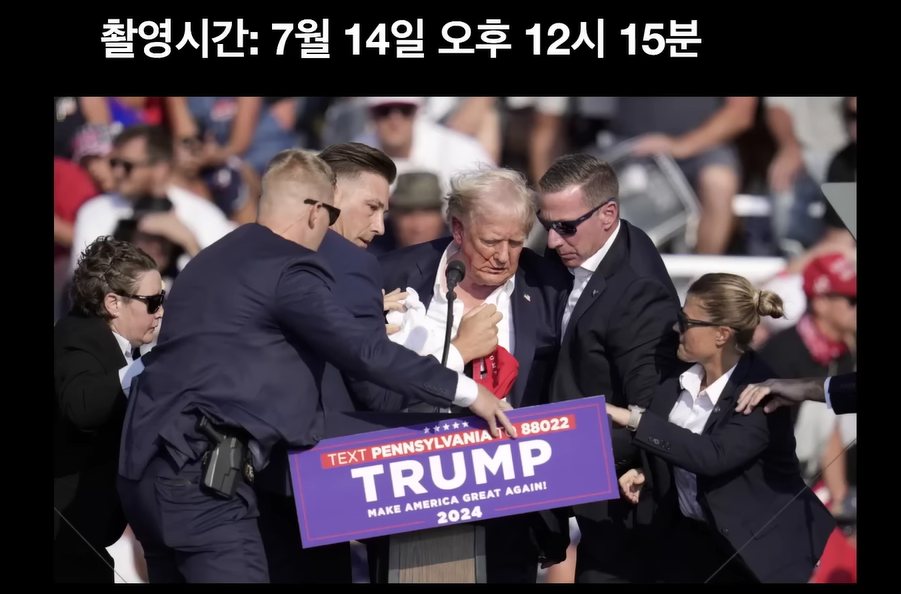 지난 7월 14일 낮 12시 15분(현지시간 13일 오후 6시 11분) 공화당 대선 후보인 도널드 트럼프 대통령이 유세 도중에 총탄에 피격었으나, 생명은 구했다.