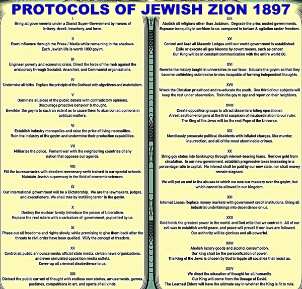 23. 사치품과 알코올 소비를 폐지하라. 우리의 왕은 권력의 화신이 될 것이다. 유대인의 왕은 우리에게 저항하는 모든 사회를 전복하기 위해 신에 의해 선택되었다.