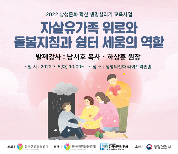 생명사랑 목회포럼은 오는 7월 5일 오전 10시 생명의전화 대강당에서 남서호 목사와 하상훈 원장을 강사로 "자살유가족 위로와 돌봄지침과 쉼터 세움의 역할"에 대해 포럼을 개최한다. 사회복지법인 생명의전화 본부는 서울특별시 성북구 오패산로 26.(성북구 하월곡동)에 위치하고, 대강당은 3층이다.