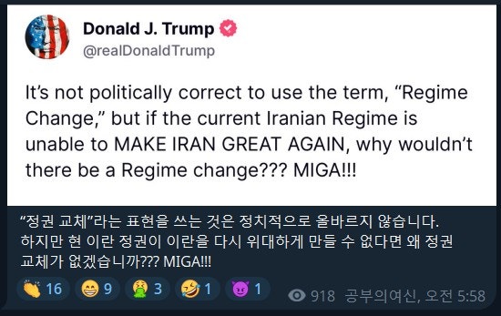 그런데 레짐 체인지는 트럼프가 마음대로 할 수는 없다. 자신이 분위기만 조성해 준다면, 이란 국민들이 알아서 할 것으로 보는 것이다. 현재 미국에 망명 중인 팔라비 2세 왕세자인 레자 팔라비가 등판을 준비하고 있다. 이 전쟁이 끝나고 향후 세계 계엄령과 함께 네사라/게사라가 발동되면, 당연히 레자 왕세자가 이란의 새로운 대선후보로 등판하지 않을까?