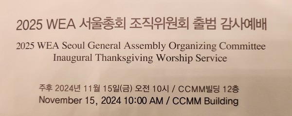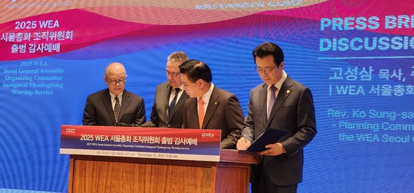 2025 WEA 서울총회 조직위원회 출범 감사예배가 지난 11월 15일 오전 10시 CCMM 빌딩 12층에서 WEA측 인사들과 신학위원들, 그리고 많은 언론사 기자들이 참석하여 개최되었다.