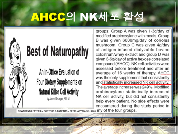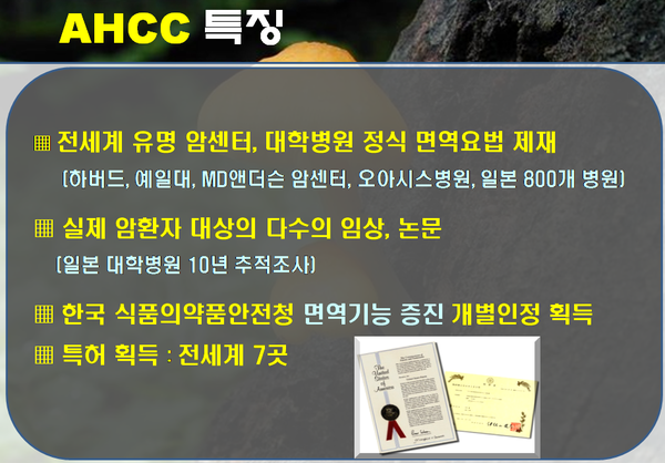 AHCC는 면역세포의 식량인 베타글루칸과 알파글루칸을 주성분으로 하는 면역증강식품이다. 또한 세계에서 가장 강력한 항암식품이다.