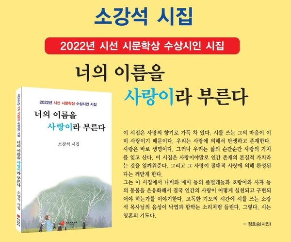 이 시대의 최고의 시인이신 정호승 시인께서 “이 시집은 사랑의 향기로 가득 차 있다. 시를 쓰는 그의 마음이 이미 사랑이기 때문이다. 고독한 기도의 시간에 시를 쓰는 소강석 목사님의 음성이 낙엽과 함박눈 소리처럼 들린다. 그렇다. 시는 영혼의 기도다.”라는 추천사를 써 주셔서 너무나 감사했습니다.