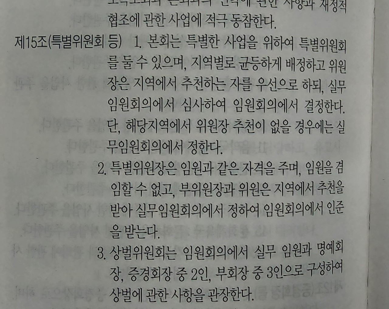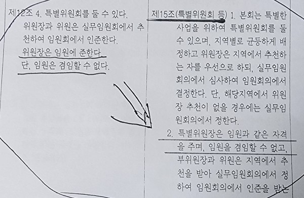 이는 개정 전 회칙 제12조 4항에 보면 "특별위원회를 둘 수 있다. 위원장은 임원에 준한다. 단, 임원은 겸임할 수 없다."고 되어있다. 또 개정 전 회칙 제8조 2항에 보면 "특별위원장은 임원으로 본다"고 되어있다.
