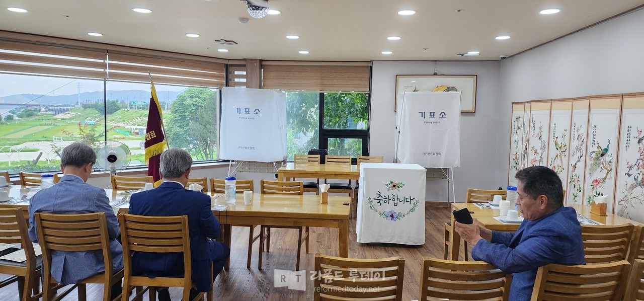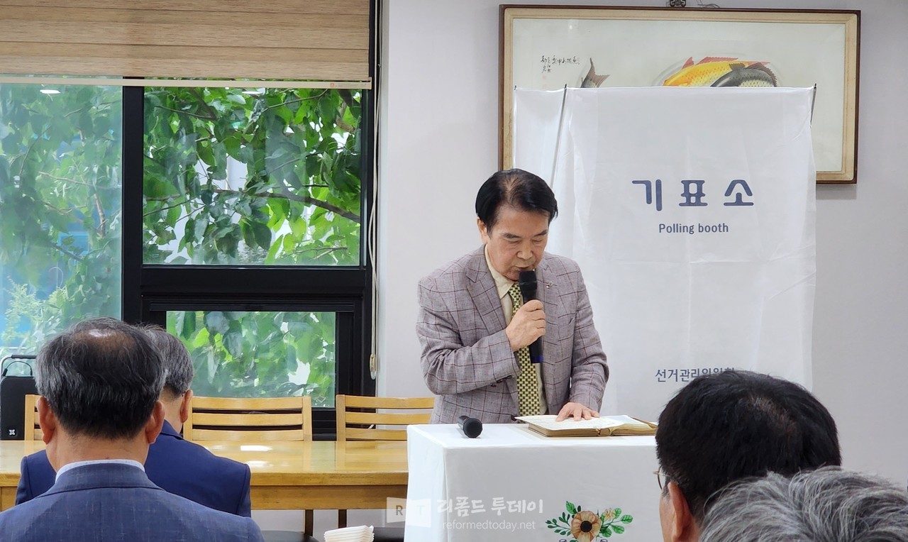 예배후 회의진행 사회를 누가 맡느냐?는 문제로 이의제기가 있어서, 증경회장단이 따로 모여서 양호영 명예회장에게 사회를 맡도록 결정했다. 서기의 회원점명이 있었다. 후보자 3명을 놓고 무기명 비밀투표로 진행하고, 후보자 이름 석자를 자필로 쓰도록 했다. 핸드폰을 맡기고 기표소에 들어가기로 했다. 인증샷을 방지하기 위함이라고 한다. 다득표자가 당선되고, 동점시에는 생년월일 순으로 당선자를 정하기로 했다. 후보자 정견발표는 하지 않기로 하고 투표에 들어갔다. 참관인은 후보자별로 투표권자 중에서 각1명을 추천하기로 했다.