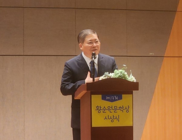 저는 황순원의 '소나기'에 나오는 소년처럼 지리산 자락에서 태어나 자랐습니다. 그런 제가 대기권 밖의 별 처럼 마음속으로 흡모하고 동경하던 황순원 선생님의 문학상을 받게 되어서 큰 영광으로 생각합니다. 황순원의 문학정신은 순수와 절제의 서정적 미학이라고 생각합니다. 황순원 선생님께서는 글을 쓰실 때 합부로 칼을 휘젓듯이 쓰지 않고 순수하면서도 절제의 조화를 이루는 문학 세계를 추구하셨습니다.