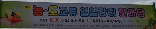 지난 10월 30일 총회자립개발원 광주전남권역위원회(위원장 조동원 목사)에서 6차 농도교류 일일장터 한마당(소위원장 서종석 목사)을 광주 동명교회(이상복 목사) 일원에서 성황리에 성료했다. 동명교회에서 행사 지원에 다수가 참여했고, 권역위원회 간사들이 참여하여 행사를 수행했다.