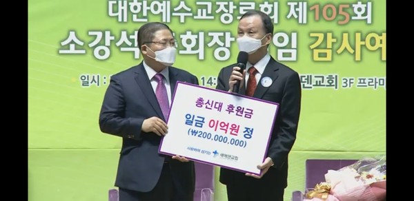 소강석 예장합동 총회장은 지난 9월 24일 취임 감사예배를 드리면서 총신대 발전기금으로 2억 원을 쾌척하였다. 이재서 총장은 장학금이 아닌 발전기금 2억은 단위 교회로서는 총신대 역사상 최고 금액이라고 한다. 새에덴교회는 지난 2018년 11월 총회를 통해 총신대에 2억원의 장학금을 전달한 바 있다. 또 지난해인 2019년에도 총신대 발전기금으로 5천만원을 쾌척했다. 발전기금은 학교의 건물 수리비 등 살림살이에 쓰인다.