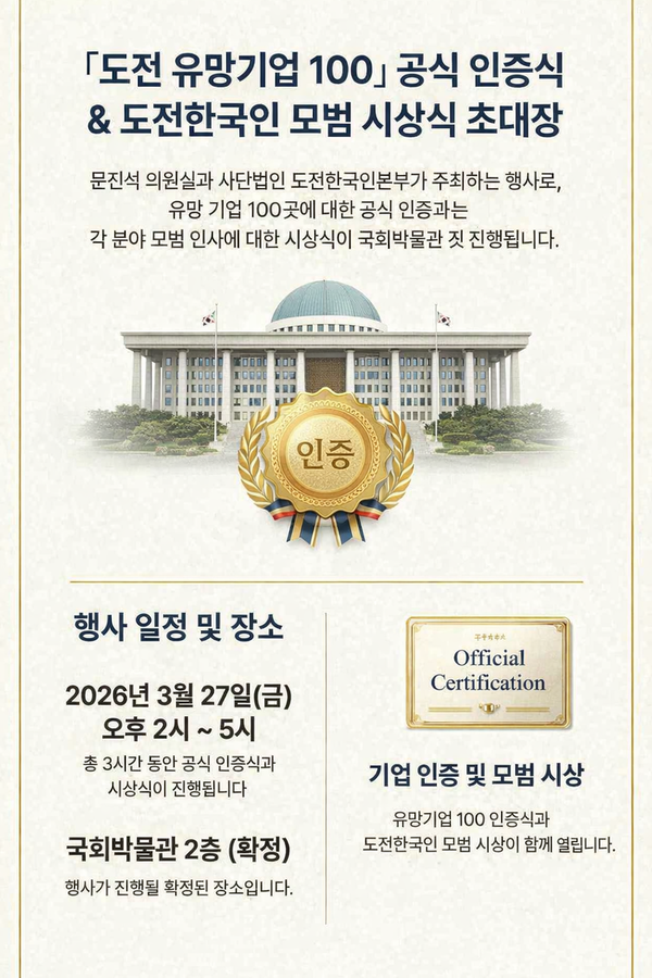 도전한국인본부가 대한민국 산업의 미래를 이끌 혁신 기업을 발굴하는 ‘천년희망프로젝트’의 일환으로 2026년 대한민국 『도전 유망기업 100』 후보를 발표했다. 이번 프로젝트는 기술적 혁신과 사회적 책임을 동시에 실천하며 대한민국 산업의 품격을 높이는 기업을 조명한다. 건물 종합관리 및 환경 위생 분야에서는 독보적인 특허 기술력과 상생 경영을 실천해온 주식회사 엘림비엠에스(Elim BMS, 대표이사 김영구)가 선정됐다.
