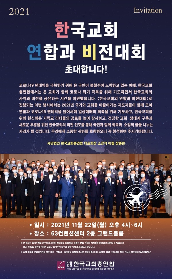 한국교회총연합(대표회장 소강석 이철 장종현)가 지난 11월 22일(월) 오후 4시, 63컨벤션센터 그랜드볼룸에서 ‘새로운 부흥의 길, 함께 열어갑시다’라는 주제로 ‘2021 한국교회 연합과 비전대회’를 개최했다.