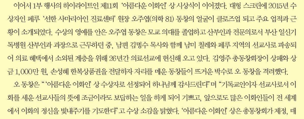 사모 오주엽 선교사는 이화여대 의대를 졸업하고 칠레와 페루지역에서 30여 년간 의료선교사로서 평생을 함께 해오고 있다. 지난 2015년 이화인의 밤에서 "아름다운 이화인"으로 선정되었다.