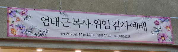서울 관악구 행운동 소재 에덴교회(관서노회 노회장 김병오 목사) 엄태근 목사 위임감사예배가 지난 11월 4일 오전 11시에 관서노회 임원들과 위임국장 그리고 육십여 명의 에덴교회 성도들과 하객들이 참석한 가운데 거행되었다. 위임국장(김병오 노회장)은 목사와 성도들의 서약을 받고, 엄태근 목사가 위임됨을 공포했다.