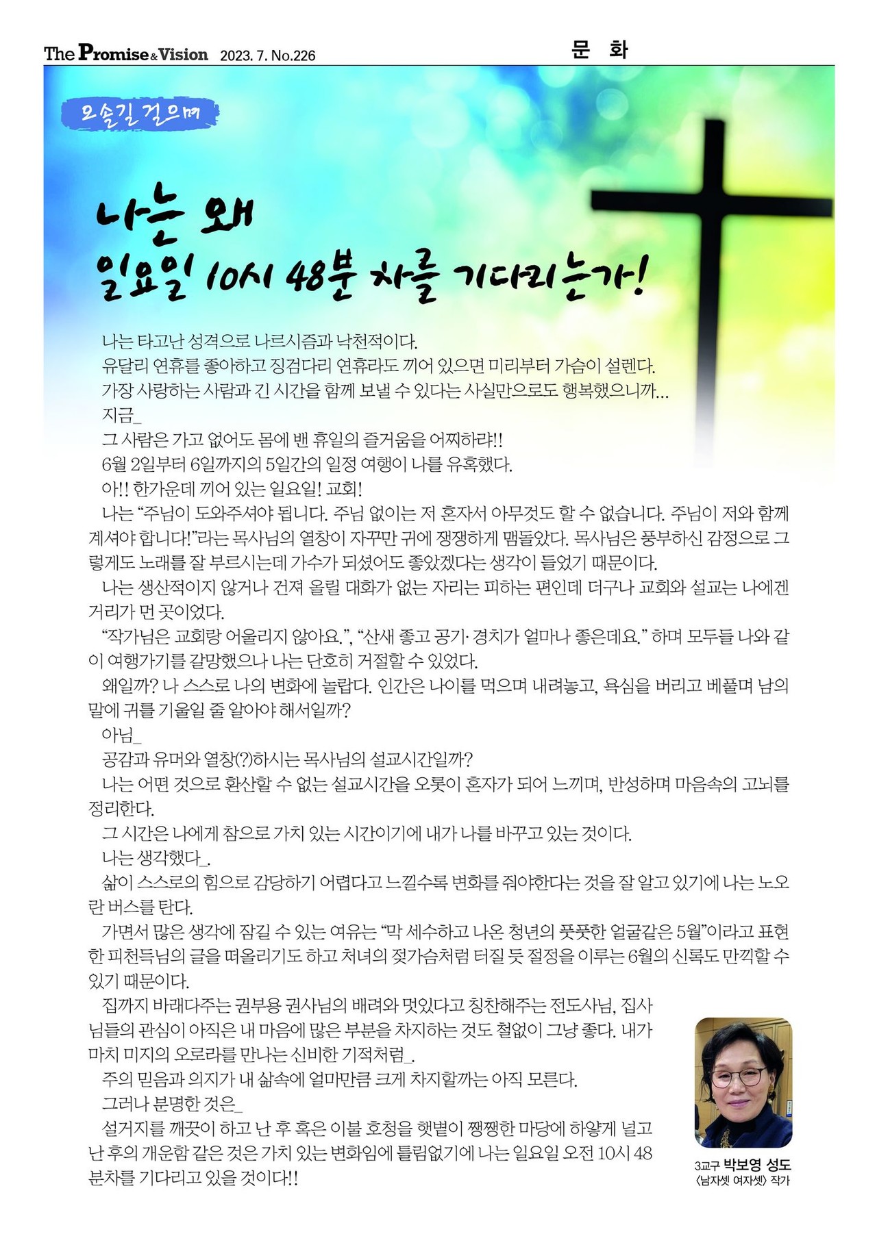 ‘남자 셋 여자 셋’이라는 시트콤을 아십니까? 당시 최고의 시청률을 올리며 초히트를 친 대한민국 최고의 시트콤이라 할 수 있습니다. 그런데 이 시트콤을 쓴 박보영 작가님을 우리 교회 권부용 권사님이 전도를 하셨습니다. 그리고 이 분께서 우리 교회 신문에 ‘나는 왜 일요일 10시 48분 차를 기다리는가!’라는 글을 쓰신 것입니다.