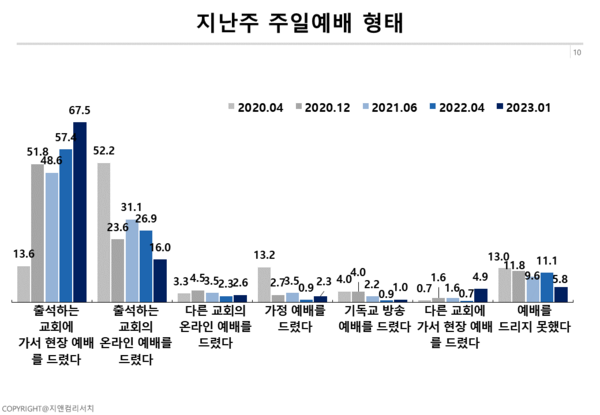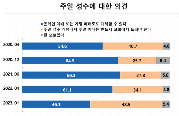 주일 성수를 ’온라인/가정 예배‘로 대체할 수 있다는 의견은 22년 4월과 대비하여 15%p가 감소했으며, 코로나 이후 50% 밑으로 내려간 것은 처음이다.
