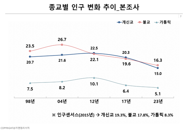 ▶ 개신교 15.0%, 불교 16.3%, 가톨릭 5.1% 개신교가 15.0%까지 감소