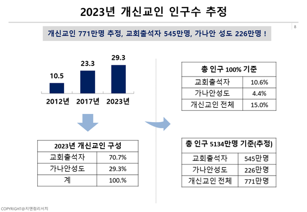 2023년 개신교인 인구를 추정했을 때, 먼저 총인구 5,134만명 중 개신교인을 15.0%로 보면 개신교인은 약 771만 명으로 추정된다. 가나안 성도는 2017년 23.3%에서 2023년 29.3%로 6년간 6.0%p 증가한 것으로 나타났다.