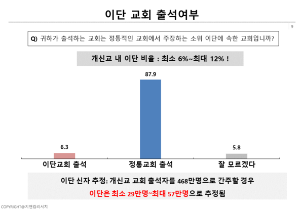 개신교인들에게 다음과 같이 질문했다. ’귀하가 출석하는 교회는 정통적인 교회에서 주장하는 소위 이단에 속한 교회입니까?‘