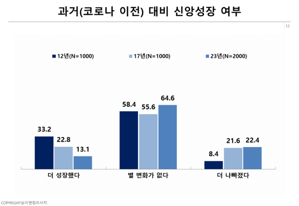 ’더 성장했다‘라는 응답은 2012년 이후로 계속해서 감소되는 추세이며, ’별 변화가 없다‘ 즉, 신앙 유지 비율은 9.0%p 늘었다.